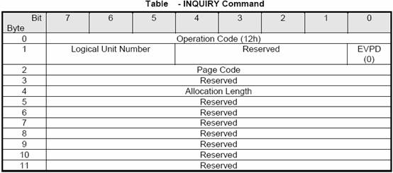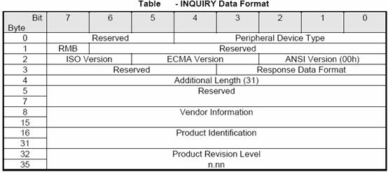 對于不同的命令,其命令塊描述符略有不同,其要求的返回內(nèi)容也有所不同,根據(jù)相 應(yīng)的文檔,可以對每種請求作出適當(dāng)?shù)幕貞?yīng)。比如,下面是INQUIRY 請求的命令塊描述符和其返回內(nèi)容的數(shù)據(jù)格式:如:INQUIRY