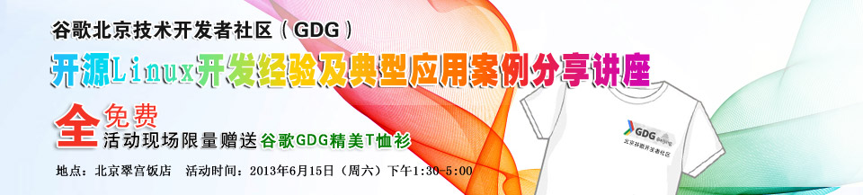 | 谷歌開發者社區GDG(原谷歌技術用戶組GTUG),將于6月15日(周六)下午1:30-5:00,在北京翠宮飯舉辦一場開源Linux開發經驗及典型應用案例分享講座,培訓講座中將通過三個專題與眾多開源Linux技術愛好者一起分享嵌入式Linux及Android開發的高級應用進階技術,以大家進入Linux開發高級應用領域。 活動限額300名,先到先得!我們將根據注冊的先后順序、選擇場地能夠容納的人數給您發參加講座的確認信。若超出場地容納限制,我們會邀請這次不能來的朋友們參加我們未來舉辦的同樣的活動。后續北京谷歌開發者社區將陸續舉辦同樣的活動,盡量滿足更多開發工程師和技術愛好者的需求,歡迎您來參加! |