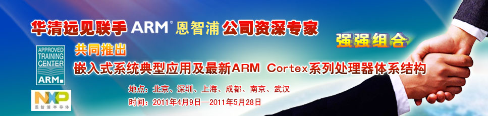 華清遠(yuǎn)見(jiàn)教育集團(tuán)攜手全球的半導(dǎo)體知識(shí)產(chǎn)權(quán) (IP) 提供商ARM公司及知名的半導(dǎo)體公司恩智浦半導(dǎo)體NXP Semiconductors N.V.,共同推出主題為“嵌入式系統(tǒng)典型應(yīng)用及新ARM Cortex系列處理器體系結(jié)構(gòu)”的全國(guó)大型巡回公益技術(shù)講座,來(lái)自ARM、恩智浦及華清遠(yuǎn)見(jiàn)的業(yè)內(nèi)專家和資深講師將分別針對(duì)三個(gè)ARM技術(shù)領(lǐng)域內(nèi)的熱點(diǎn)專題進(jìn)行精彩演講。講座將在深圳、上海、成都、南京、武漢、北京等城市陸續(xù)舉辦,誠(chéng)邀您的加入,與我們一起分享嵌入式設(shè)計(jì)及新ARM技術(shù)的饕餮盛宴。
