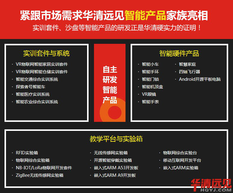 華清遠見教育集團自成立以來,始終秉持著項目實訓(xùn)為導(dǎo)向的教學(xué)模式,重視產(chǎn)學(xué)研相結(jié)合的公司發(fā)展戰(zhàn)略。教學(xué)改革、課程升級的直接目的就是為了讓所有的學(xué)員在系統(tǒng)學(xué)習(xí)之后能夠和企業(yè)的要求相對接,也就是說,目前市場上需要的是什么樣人才,華清遠見就立志培養(yǎng)什么樣的優(yōu)秀人才。因此,在此次課程升級中,華清遠見獨家引用了多種智能硬件案例到實際的教學(xué)里。不僅如此,華清遠見順應(yīng)行業(yè)大勢自主研發(fā)了多款智能項目實訓(xùn)系統(tǒng)及教學(xué)設(shè)備,提供嵌入式/物聯(lián)網(wǎng)/大數(shù)據(jù)/云計算/VRAR等高校實驗室解決方案,擴展搭配多樣化的實戰(zhàn)項目,包括智能家居、智能交通、智能醫(yī)療、智能農(nóng)業(yè)、智能倉儲物聯(lián)網(wǎng)系統(tǒng)等,讓學(xué)科實驗更豐富。培訓(xùn)+研發(fā)”雙引擎,共同打造智能硬件行業(yè)硬實力。