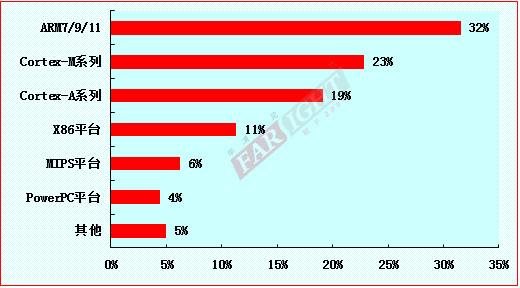 從2012-2013年度的調(diào)查統(tǒng)計數(shù)據(jù)中可以看到, ARM處理器(包括ARM7/9/11、Cortex-M系列、Cortex-A系列)毫無疑問地占據(jù)了嵌入式處理器絕大部分的市場份額(74%),在ARM及其合作伙伴的市場推動下,ARM7/9/11較前一年的統(tǒng)計結(jié)果,出現(xiàn)了非常明顯的下滑,市場份額下降了13個百分點,而新ARMv7架構(gòu)的Cortex系列處理器成功布局嵌入式移動計算領(lǐng)域并取得了快速的發(fā)展,其中定位低端的Cortex-M系列處理器和定位高端的Cortex-A處理器較一年前的統(tǒng)計結(jié)果,分布有兩個百分點的增長,已毋庸置疑地成為ARM處理器應(yīng)用的主流。隨著物聯(lián)網(wǎng)產(chǎn)業(yè)的快速發(fā)展,對低功耗微控制器的需求必然會更進一步地推動Cortex-M系列處理器的快速應(yīng)用,而高性能智能手機、平板電腦及更多智能終端設(shè)備的開速普及則使得Cortex-A系列處理器獲得了快速發(fā)展的機會。