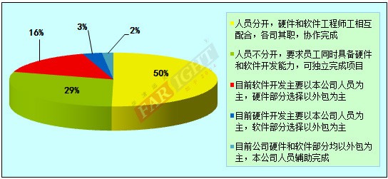 2012-2013年度的調(diào)查數(shù)據(jù)顯示,,有一半從事嵌入式產(chǎn)品研發(fā)的企業(yè)都是采用軟硬件人員分工合作完成產(chǎn)品的開發(fā)方式(50%),與去年的調(diào)查數(shù)據(jù)(62%)橫向?qū)Ρ瓤矗@一選項所占的比例也呈現(xiàn)出下降的趨勢(下降了12個百分點)。而“人員不分開,要求員工同時具備硬件和軟件開發(fā)能力,可獨立完成項目”的公司所占比例,由去年的22%上升到今年的29%(上升了7個百分點)。從這一轉(zhuǎn)變,我們可以看到:嵌入式系統(tǒng)作為一個軟硬件結(jié)合的系統(tǒng),需要嵌入式開發(fā)工程師在軟件和硬件兩個方面都不斷深化學(xué)習(xí),同時具備軟硬件開發(fā)能力的工程師,將在求職過程中擁有更多的選擇機會以及更大的成長空間。同時,從各大招聘網(wǎng)站的新搜索數(shù)據(jù)中也可以看出,目前嵌入式軟件開發(fā)人才的需求量遠(yuǎn)遠(yuǎn)大于純硬件開發(fā)人才,嵌入式系統(tǒng)項目研發(fā)差不多80%以上的工作量都是在軟件部分,軟件是嵌入式系統(tǒng)核心的部分,也是體現(xiàn)嵌入式系統(tǒng)優(yōu)勢的關(guān)鍵部分,企業(yè)對嵌入式軟件開發(fā)人才的需求必將持續(xù)上漲。