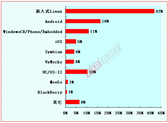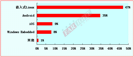 在本年度新增調(diào)研項目中新增了對未來1-2年內(nèi)嵌入式行業(yè)會占主導(dǎo)地位的嵌入式操作系統(tǒng)的調(diào)查,調(diào)查統(tǒng)計數(shù)據(jù)顯示,嵌入式Linux仍然是未來幾年內(nèi),嵌入式工程師認(rèn)可的具發(fā)展?jié)摿Φ氖走x嵌入式操作系統(tǒng),所占比例接近一半(47%),而Android智能手機操作系統(tǒng),也受到了越來越多嵌入式工程師的關(guān)注,并對其在移動手機操作系統(tǒng)中廣闊的發(fā)展空間及發(fā)展?jié)摿Τ錆M了期待。由此可見,作為開源系列的兩款優(yōu)秀的嵌入式操作系統(tǒng)(嵌入式Linux及Android),其開源的特性,無疑使其在市場競爭中,具備了強大的競爭優(yōu)勢及用戶基礎(chǔ),用戶就是王道。