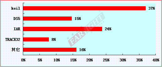 軟件開發(fā)調(diào)試工具的選擇為本年度新增調(diào)研項目,調(diào)查統(tǒng)計的數(shù)據(jù)結(jié)果顯示,keil和IAR分別以37%、24%的比例成為嵌入式開發(fā)者的主要調(diào)試工具,總計占所有參與調(diào)研人數(shù)的61%。合適的調(diào)試工具的選擇使用,可以大大加快產(chǎn)品的開發(fā)進度。這也使得在調(diào)試工具層面的技術(shù)支持和發(fā)展成為研發(fā)過程中需要考慮的因素之一。同時,這個調(diào)查結(jié)果也為初學(xué)者如何選擇開發(fā)工具提供有價值的參考。