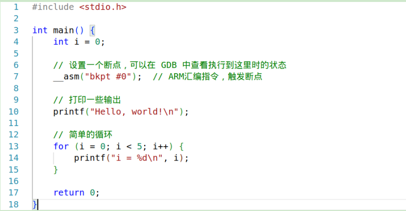 l 設置斷點:可以設置斷點在 main 函數或任何其他地方(例如,剛剛插入的 __asm("bkpt #0"))。