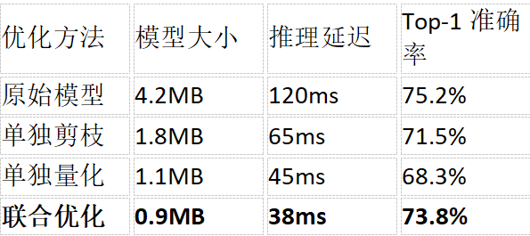 實驗表明,聯合優化在模型大小和延遲降低的同時,精度損失顯著小于分步優化。